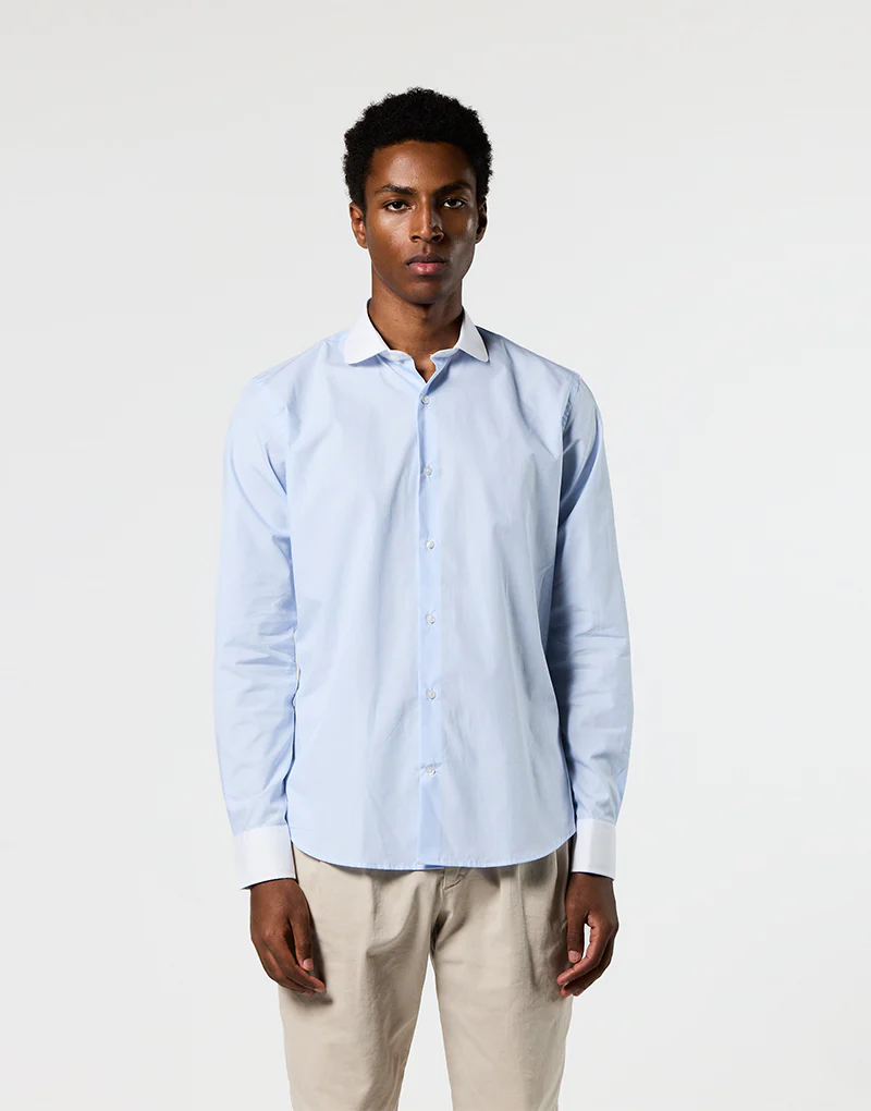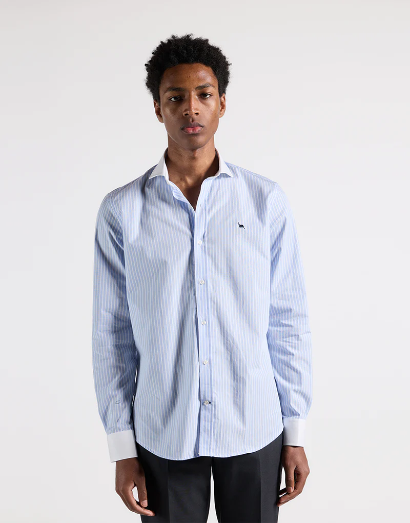 Camisa azul raya blanca cuello y puño blanco