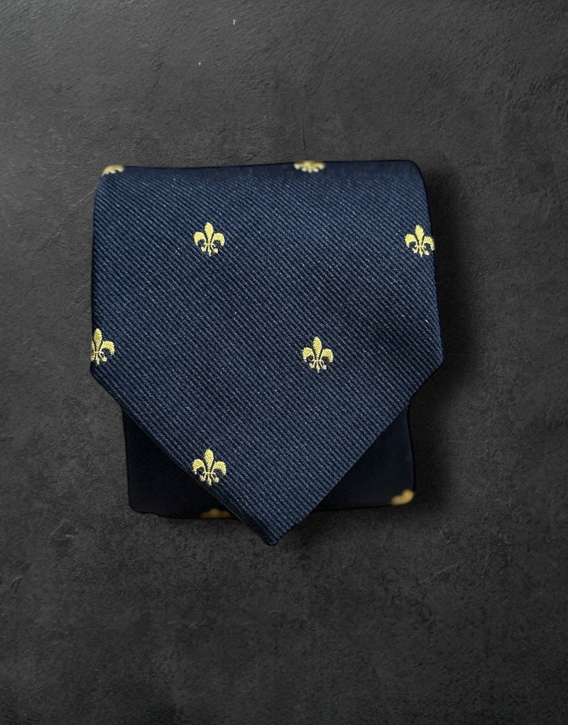 Corbata seda jacquard azul marino flor lis oro