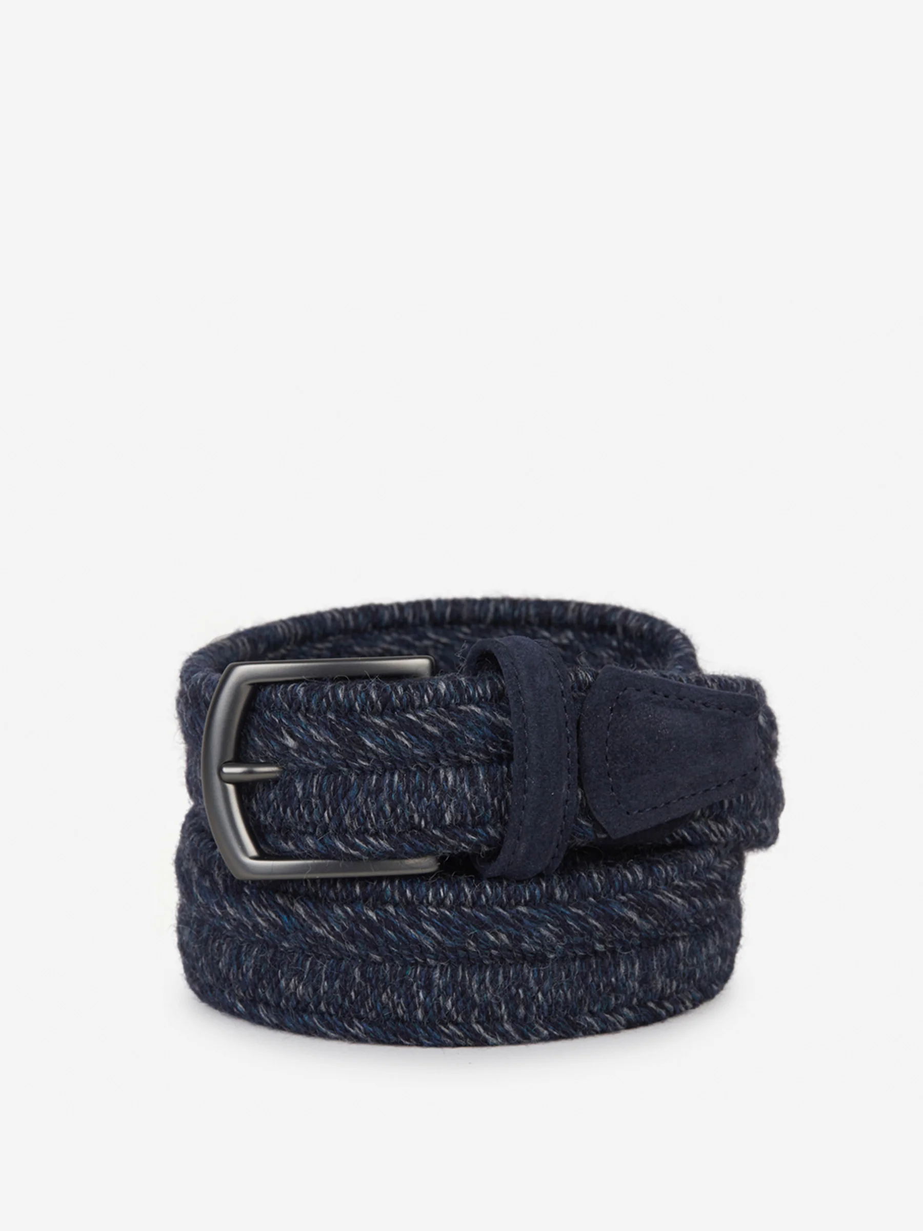 Santa Eulalia mottled navy blue braided belt. Suede leather details. «D» dark grey metallic buckle. Made in Italy.