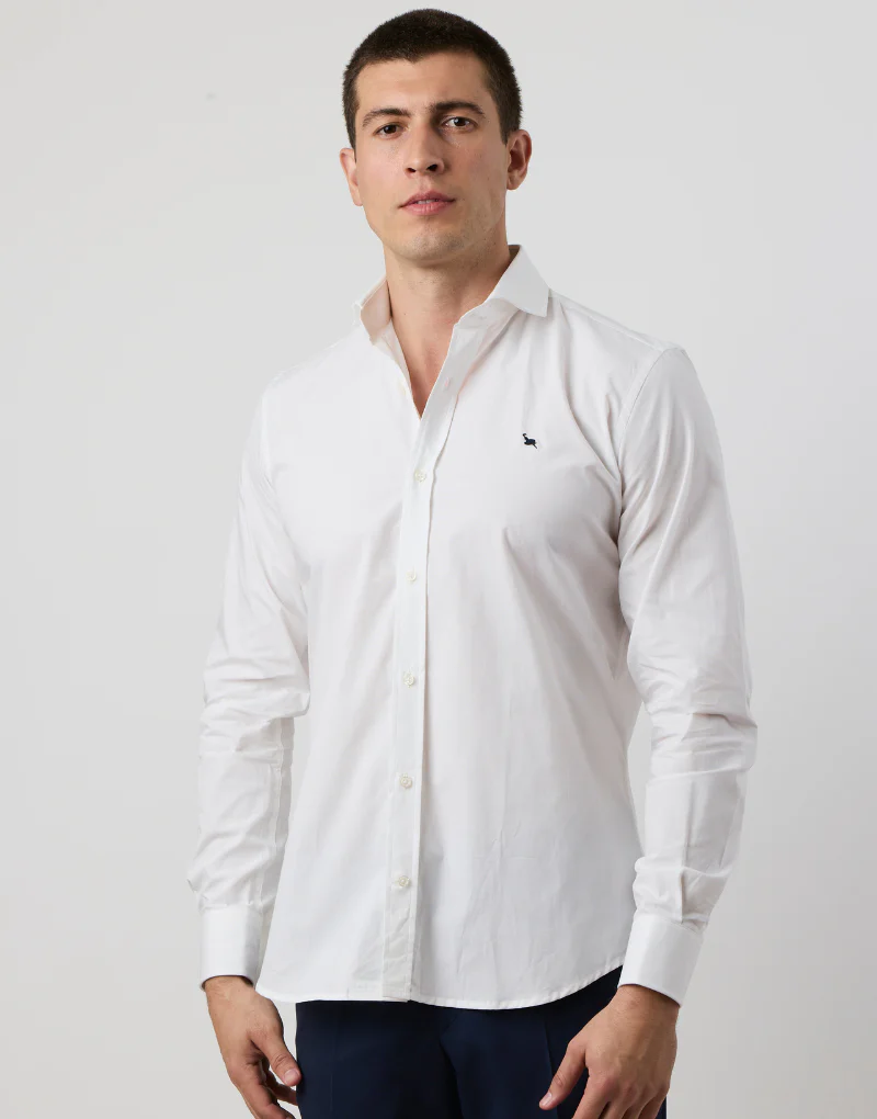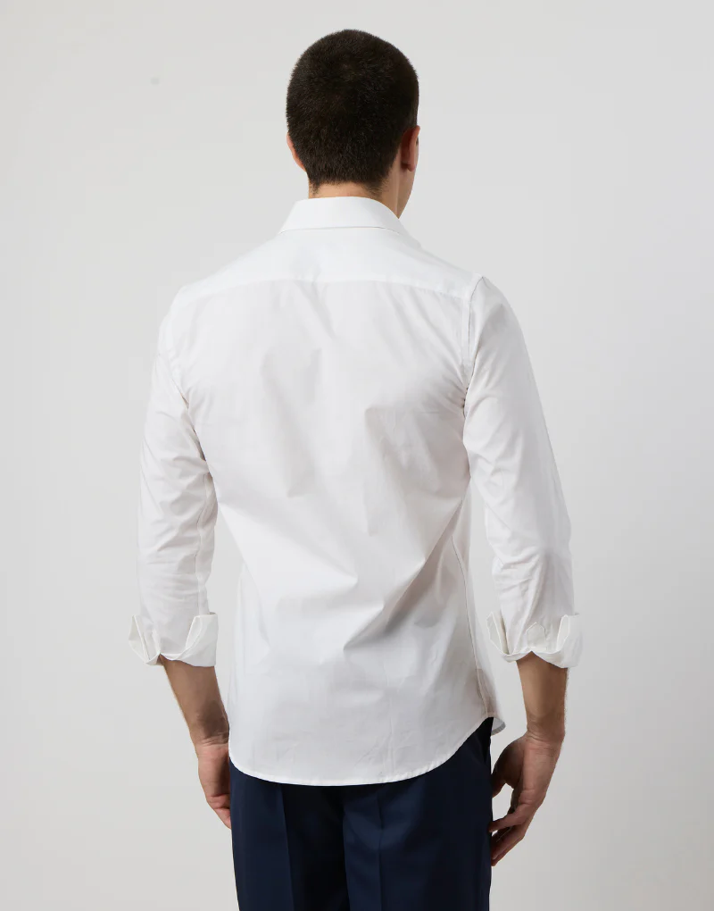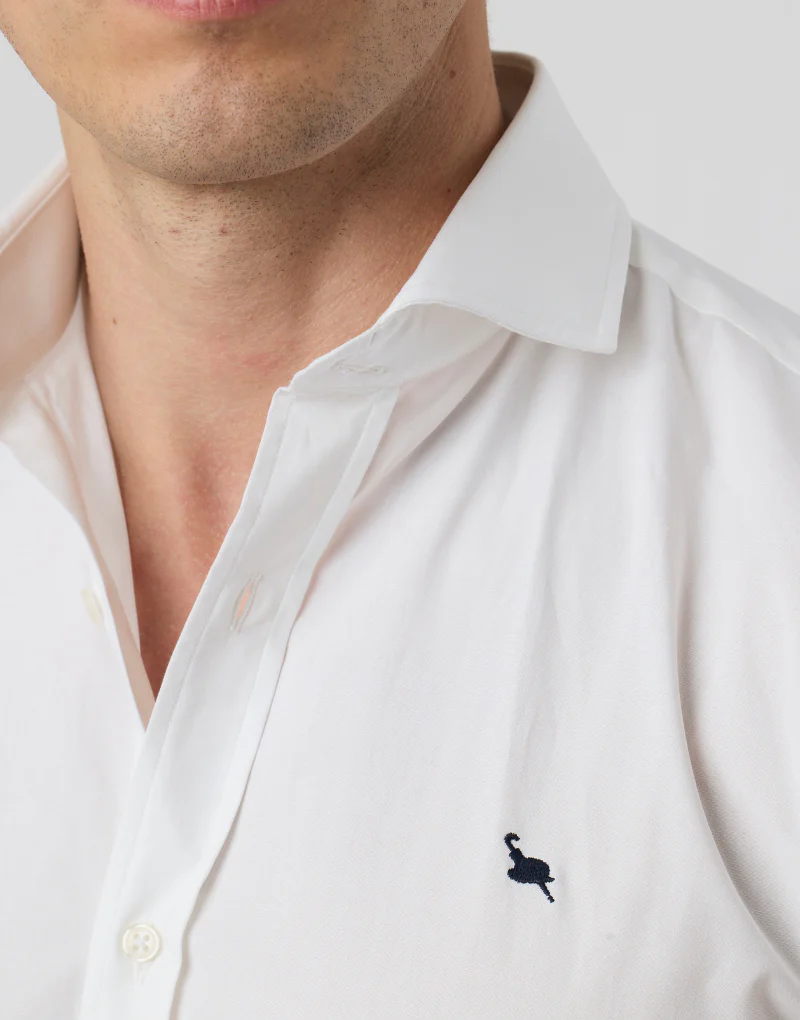 Esta camisa de vestir estilo fil a fil es una elección elegante para cualquier ocasión. Con cuello italiano y manga larga con puños simples con doble ojal lo que permite el uso de gemelos, esta camisa de corte medium fit se ajusta perfectamente al cuerpo. El logo de la marca bordado en el frontal añade un toque de exclusividad.