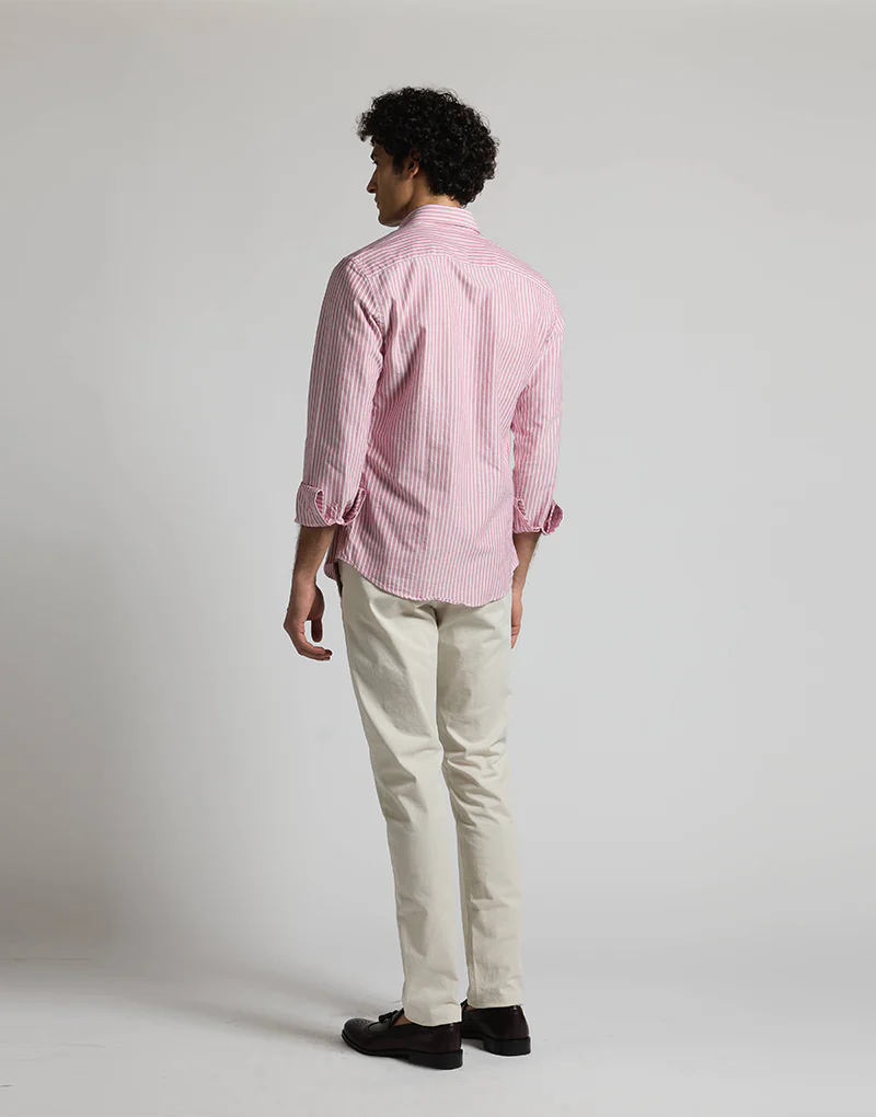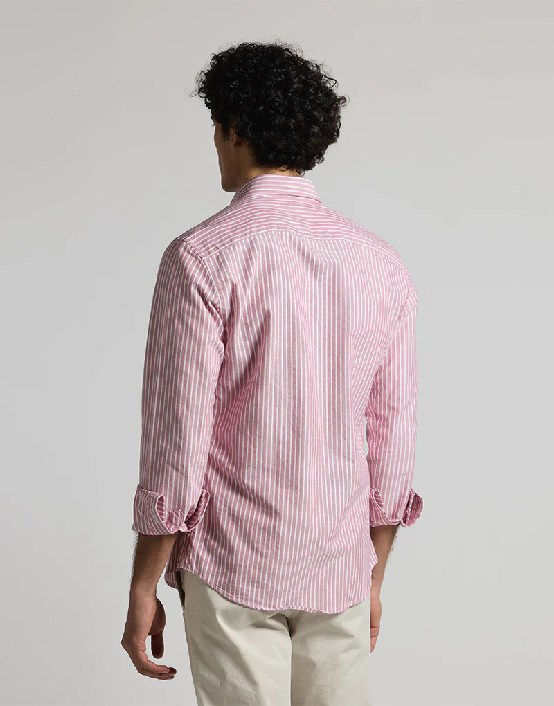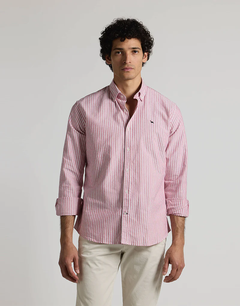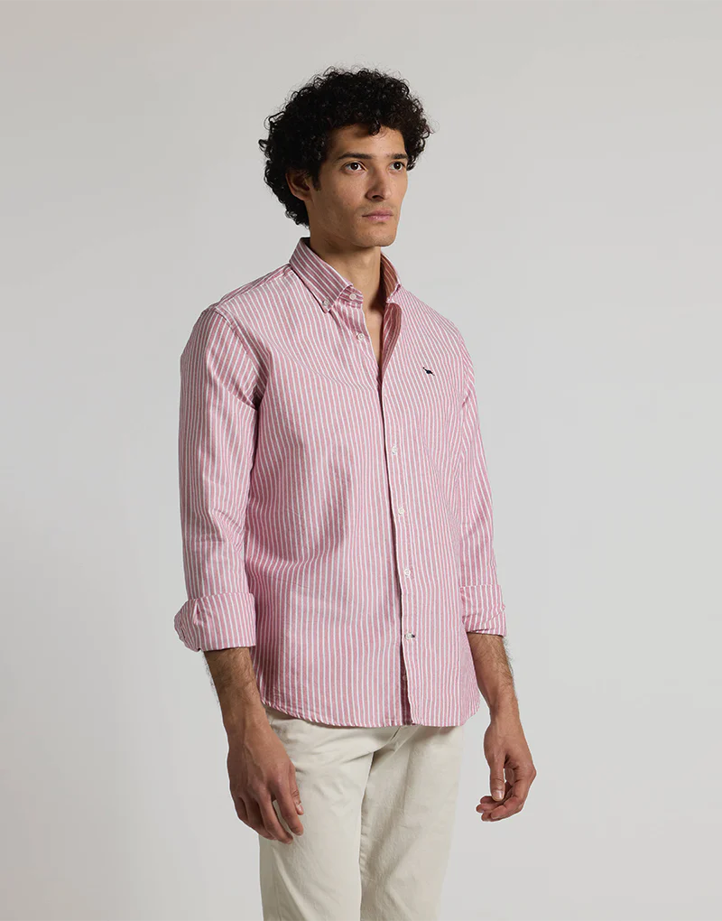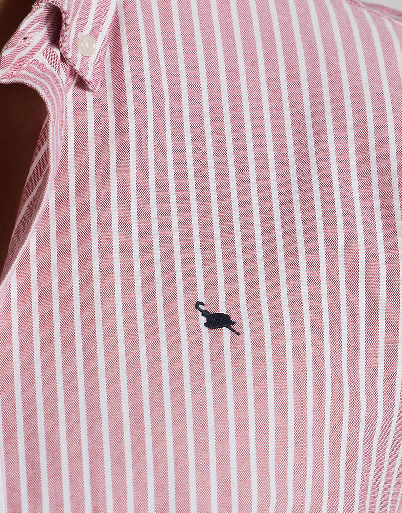 Camisa de oxford de fondo burdeos y raya blanca, el oxford es uno de los tejidos de más durabilidad ya que resiste muy bien los lavados, con patrón regular fit presenta botones en el cuello y bordado Bowler Hat en el pecho.