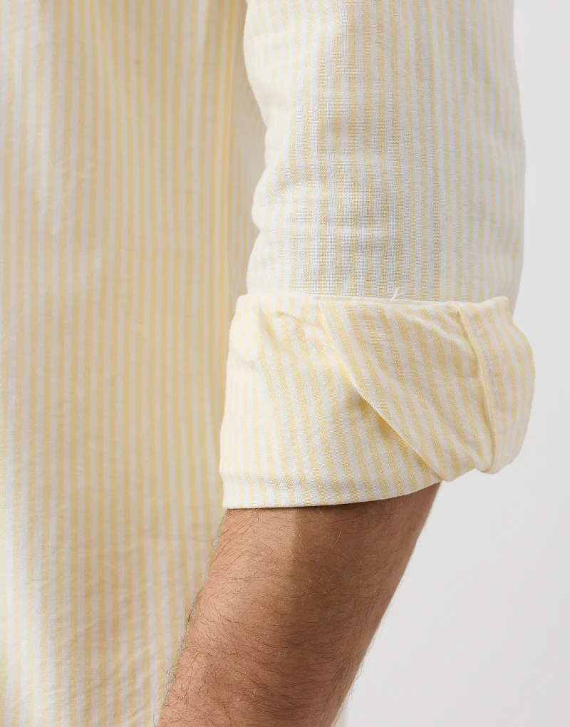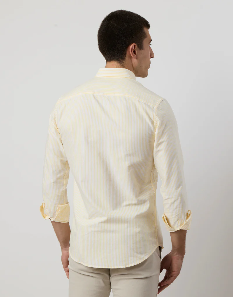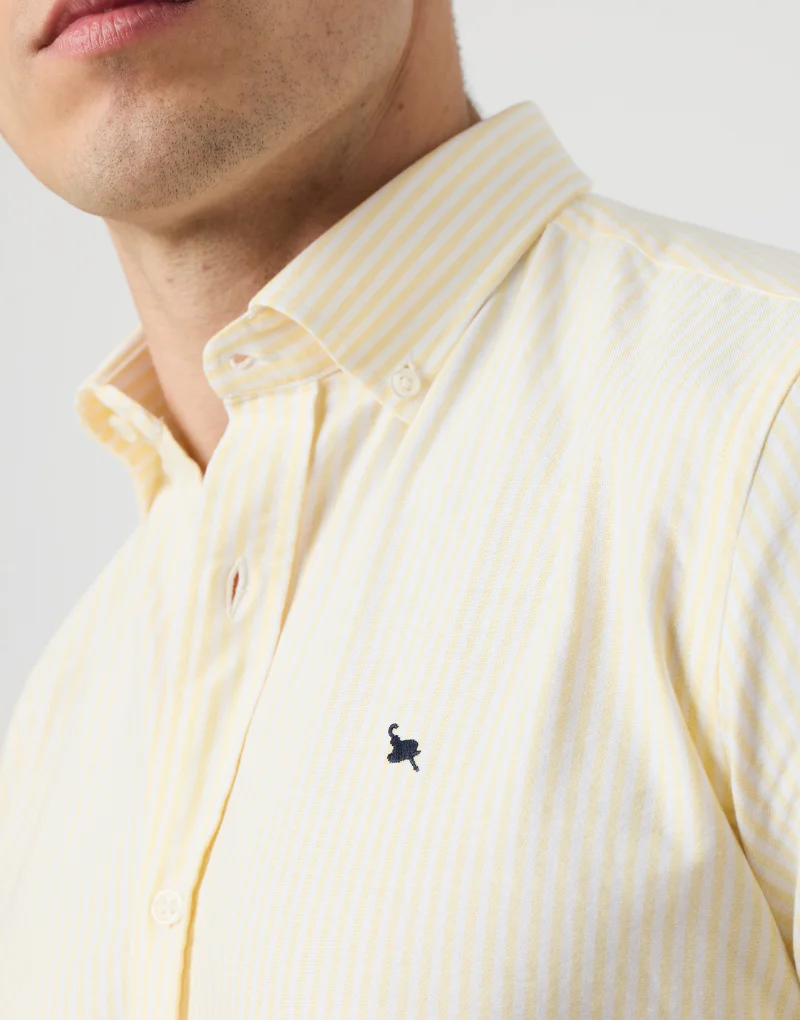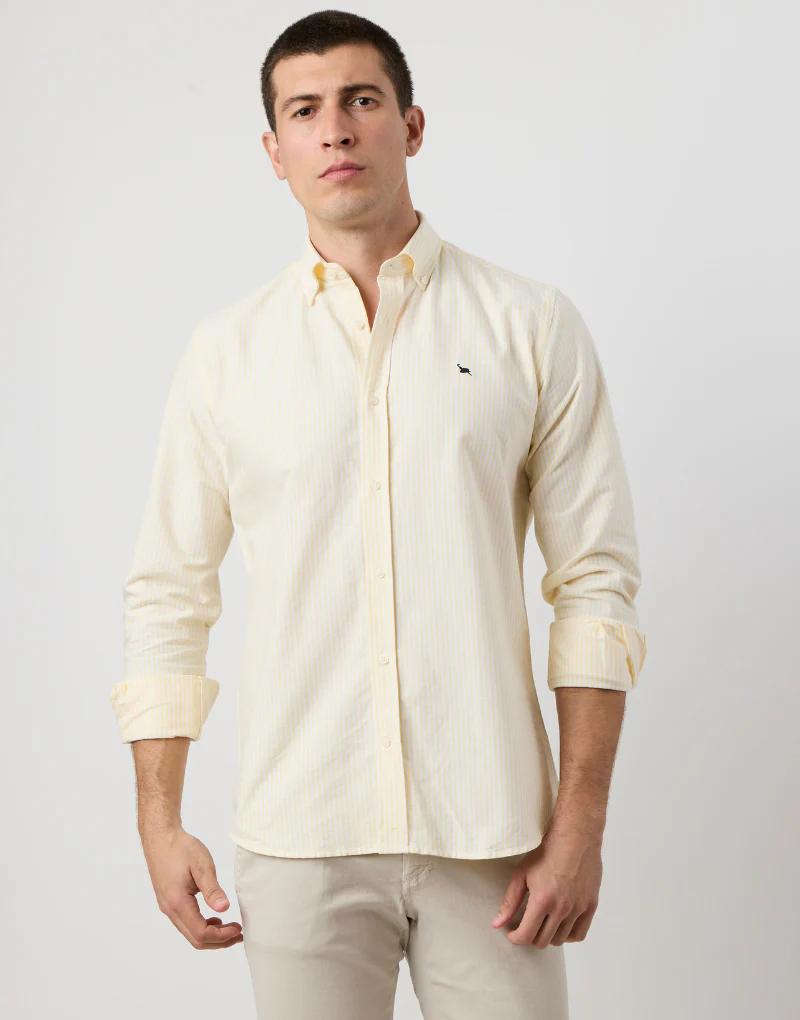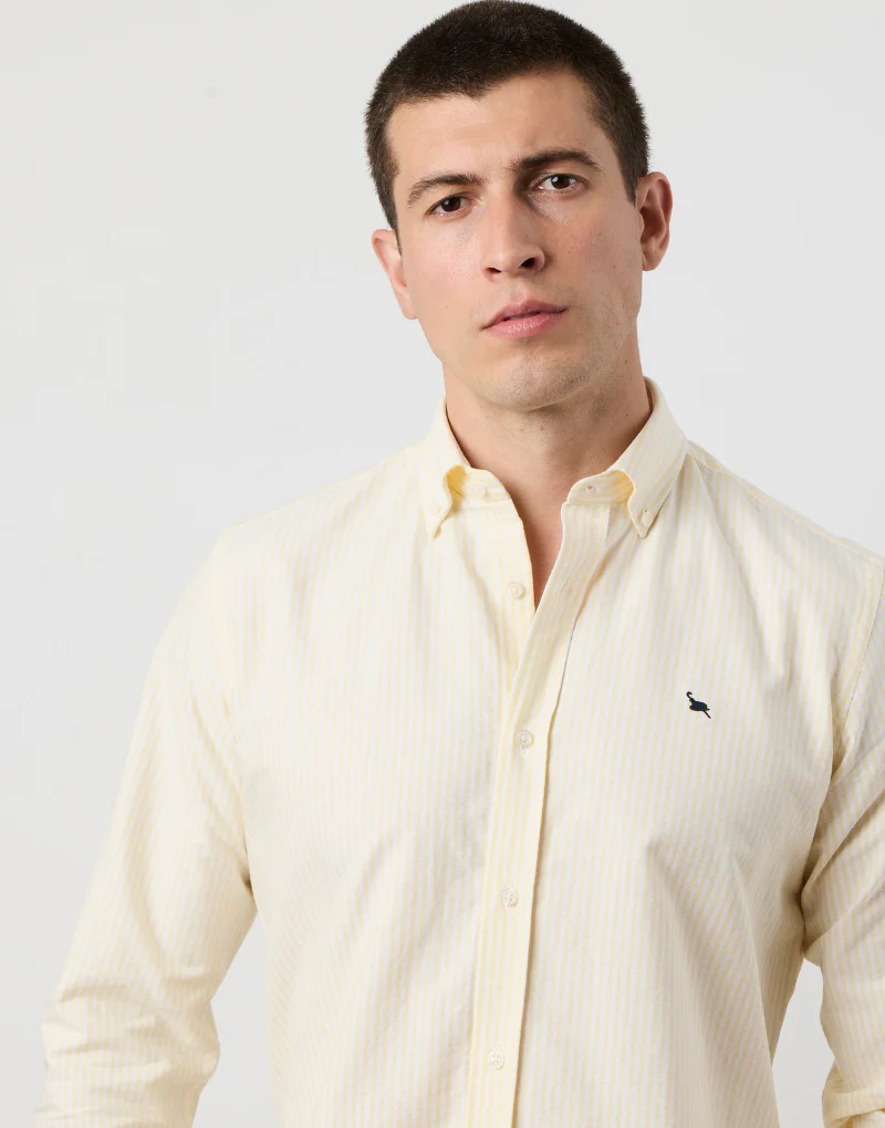Camisa sport de rayas anchas confeccionada en 100 % algodón de alta calidad. Con un patrón ‘regular fit’, presenta un cuello button down, tapeta central con botones blancos de efecto nacarado y un logo azul marino bordado en el pecho. El diseño de raya ancha aporta personalidad a la prenda.