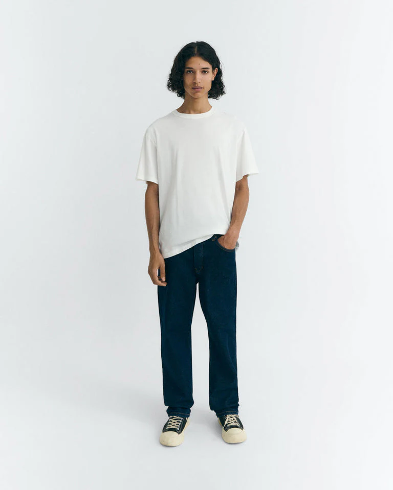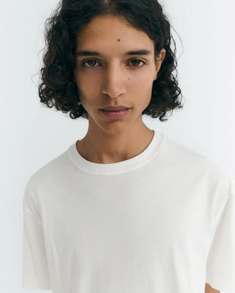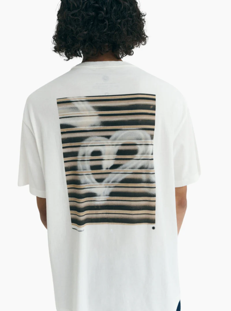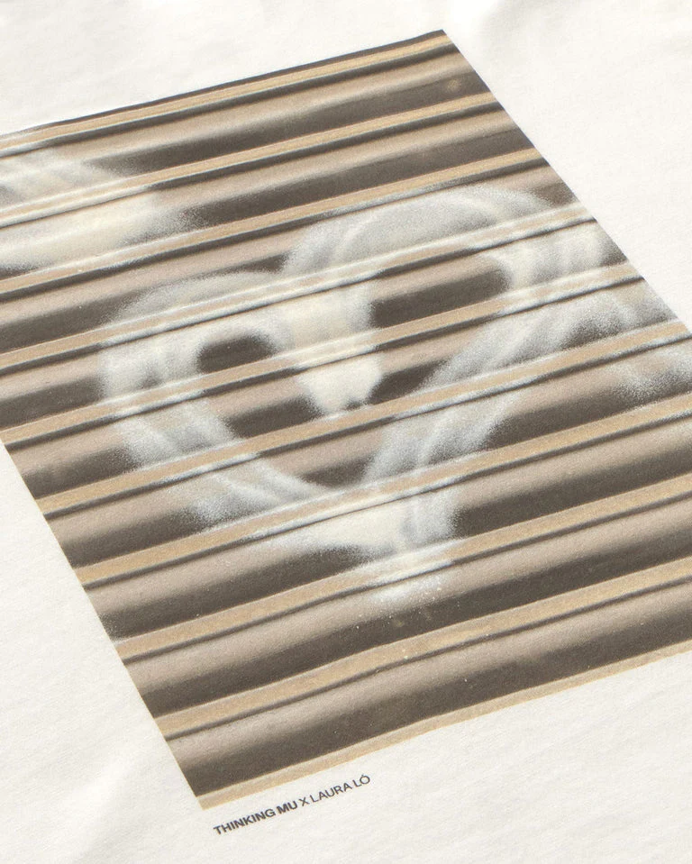 La camiseta Grafitti Aaron R de Thinking MU une arte y confort: colaboración con la fotógrafa Laura Ló, print digital en la espalda y gramaje 180 gsm en 100% algodón orgánico (GOTS). Diseñada en Barcelona y hecha en India con acabado suave y caída cómoda.