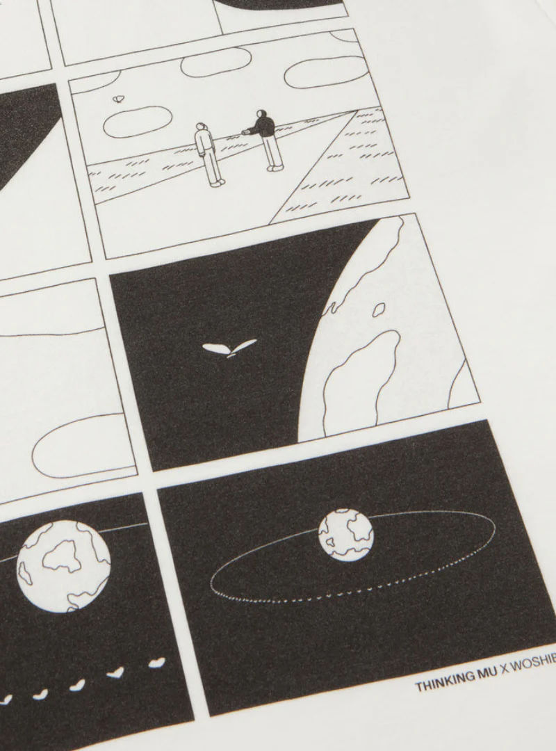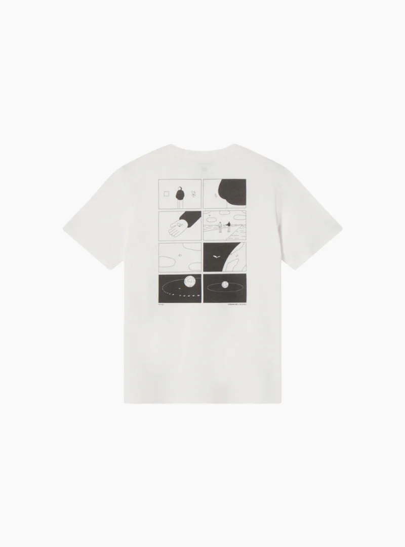 Camiseta blanca Pocket Zach hecha de algodón orgánico trabajada en colaboración con Woshibaii. La obra del artista se ha impreso en digital.