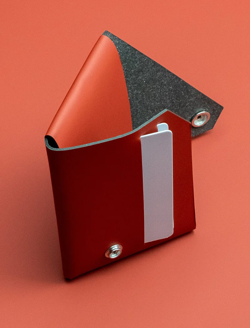 Elaborado a partir de residuos de la industria del cuero. WALLET representa todo el espíritu de la colección FOLD. Viene en paquete plano y listo para doblarse en su forma funcional. Con dos aberturas, admite tarjetas, billetes e incluso monedas.