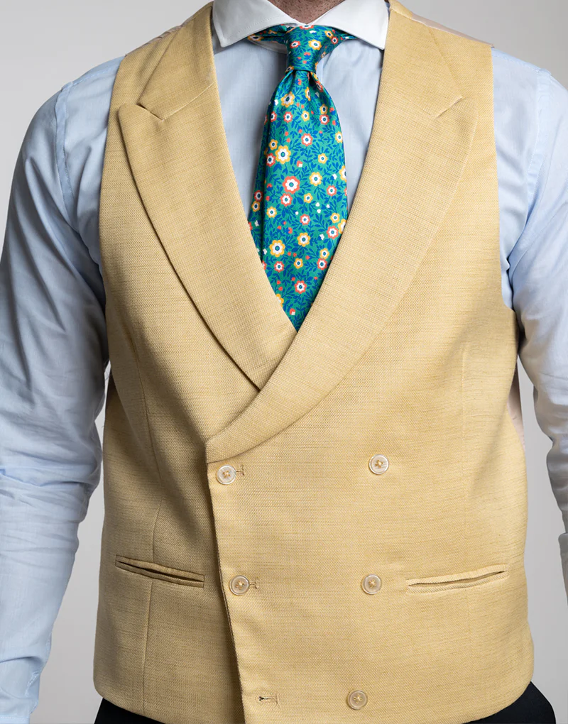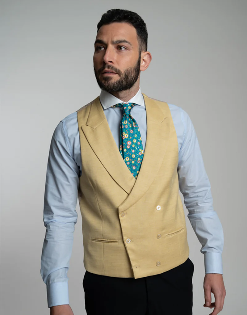 Chaleco en color vainilla cruzado con solapa de pico, ideal para combinar con tu traje, americana o chaqué.