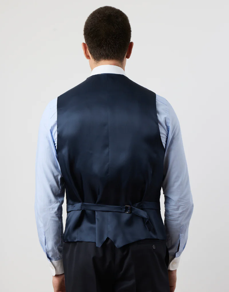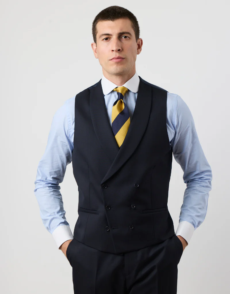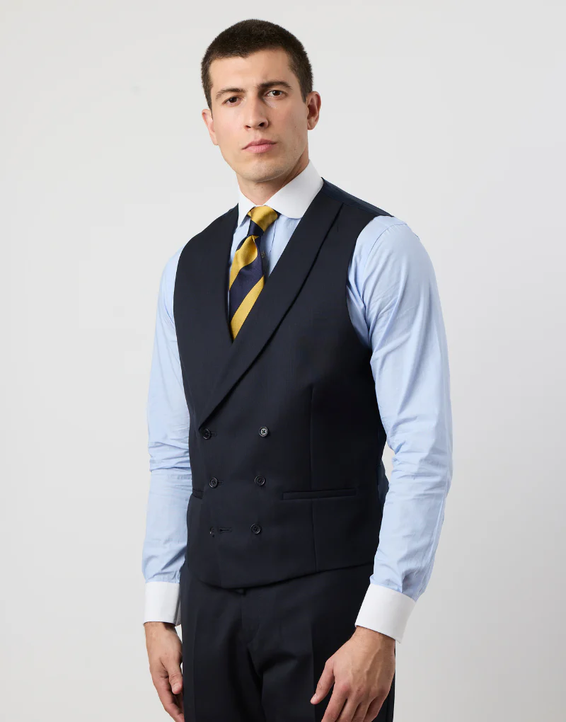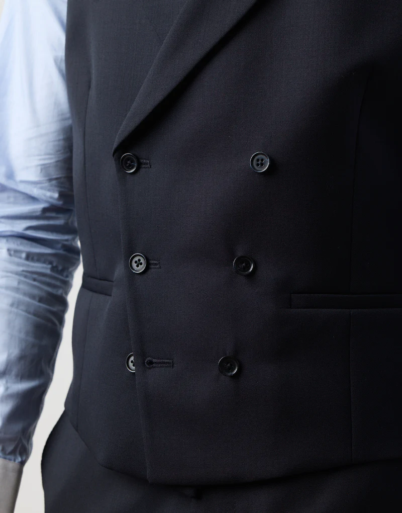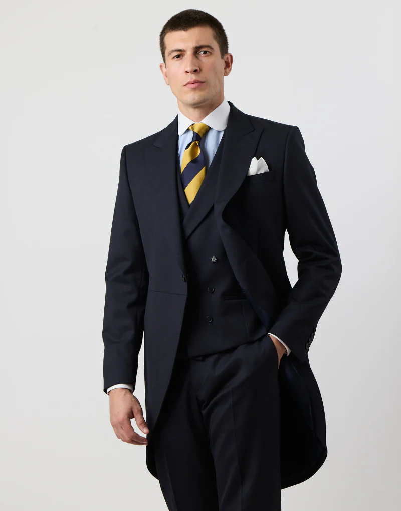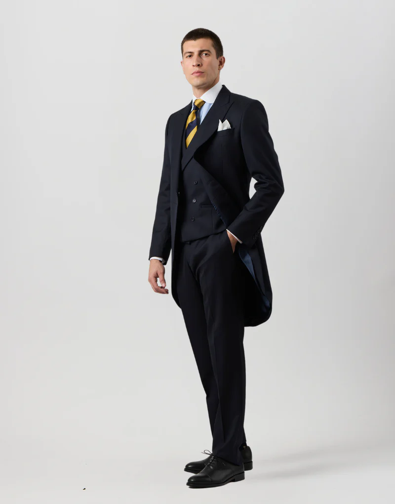 Si buscas un chaqué de calidad premium, este modelo es para ti. Fabricado en Portugal con lana 100%, está diseñado para quienes aprecian la elegancia clásica y el confort. Cuenta con solapa de pico, bolsillo de vivo en el pecho y cierre simple de un botón. El chaleco cruzado de solapa redonda y el pantalón con ceñidores laterales completan este conjunto de tres piezas, con detalles como el doble botón en la espalda, puños abotonados y el icónico faldón trasero dividido. Ideal para destacar en cualquier ocasión especial.