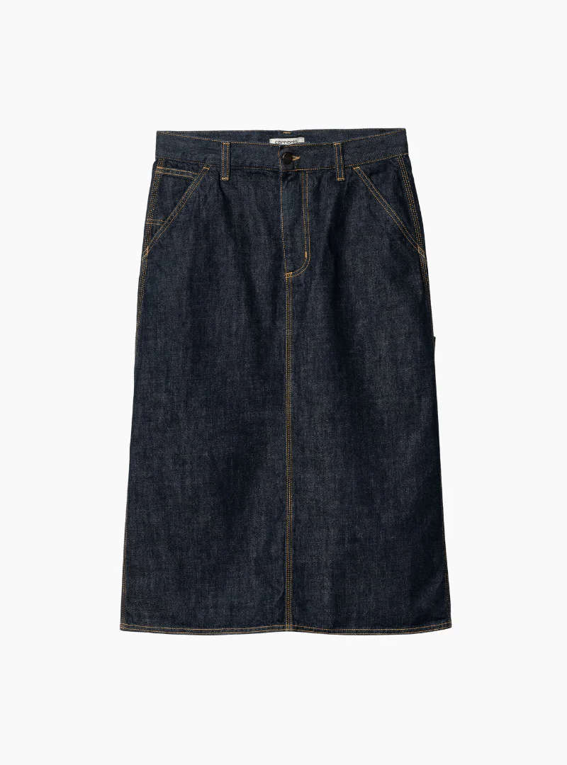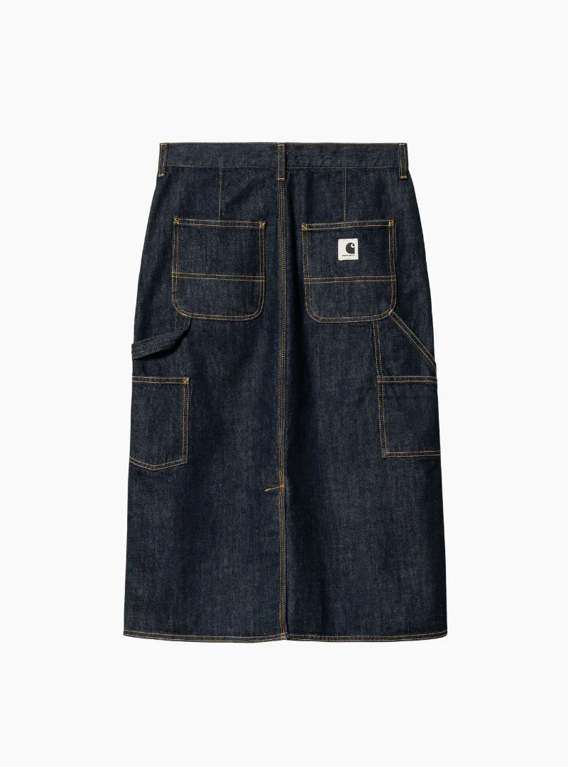 La Women’s Single Knee Skirt tiene un corte relajado y está confeccionada en denim de algodón pesado. La falda tiene bolsillos para herramientas, puntadas triples y una trabilla para martillo que añaden el toque utilitario. Una etiqueta cuadrada tejida completa el diseño.