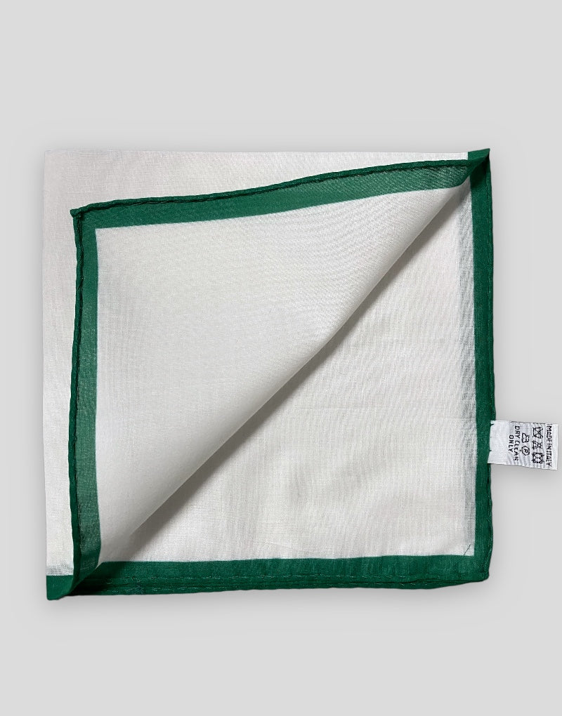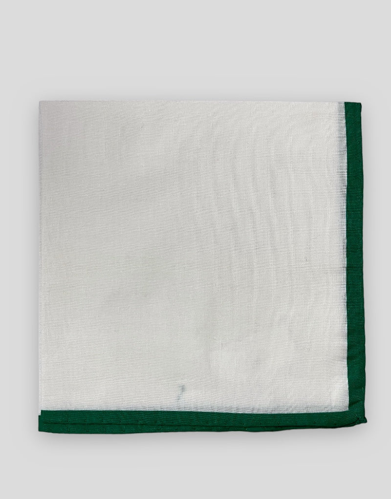 Pañuelo liso blanco confeccionado en algodón 100% con filo de color verde, ideal para darle un toque elegante a tu chaqué o a tu traje, los puedes colocar recto o en forma de pico.