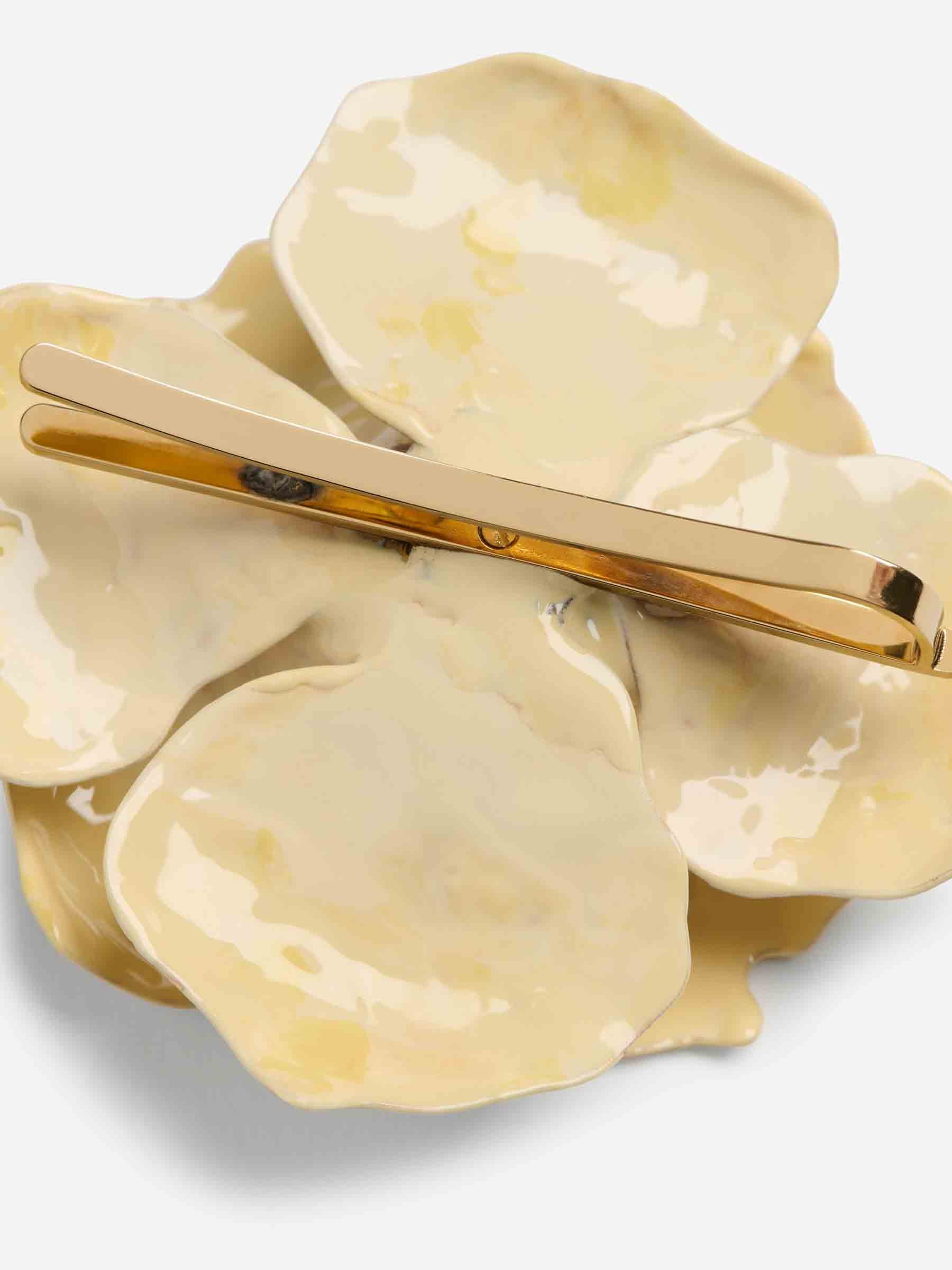 • Flor de metal esmaltado con pétalos irregulares esmaltados y pistilos de tela pintados