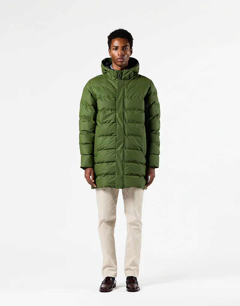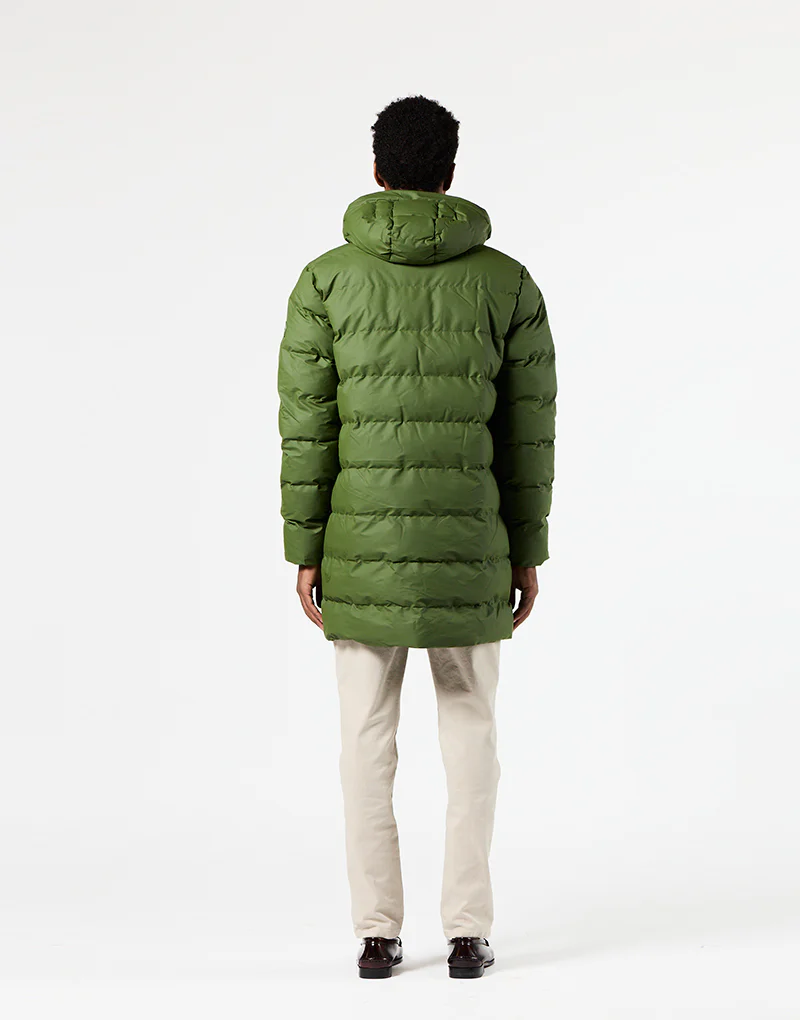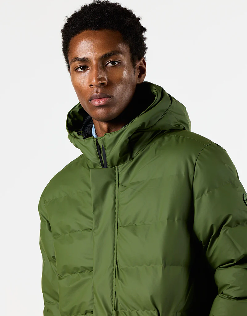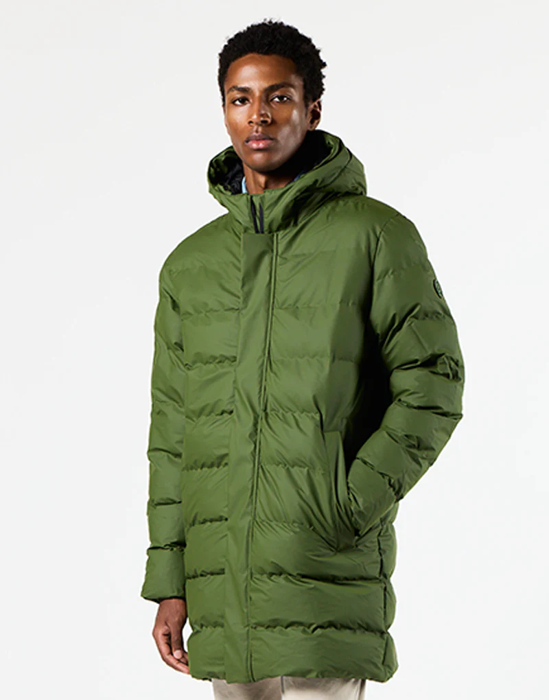 Puffer o abrigo largo acolchado de hombre diseñado para mantenerte caliente y para ofrecerte un abrigo ligero y práctico. Está fabricado con poliuretano impermeable y acolchado con una capa de aislamiento sin plumas. Este abrigo de invierno presenta todas las costuras selladas para una impermeabilización total, una cremallera resistente al agua en la parte delantera y bolsillos con forro polar en el interior para mayor calidez. Se ajusta a la talla real