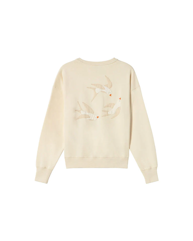 La sudadera Bird Jodie de Thinking Mu combina calidez, diseño artesanal y sostenibilidad. Confeccionada en 100% algodón orgánico de gramaje grueso (450 g/m²), presenta un corte relajado, cuello redondo y mangas largas. El detalle protagonista es su bordado a mano en forma de patch, que aporta un toque artístico y único a cada prenda.