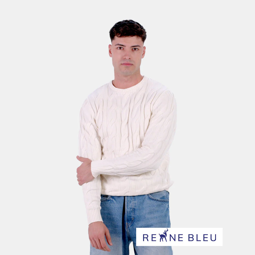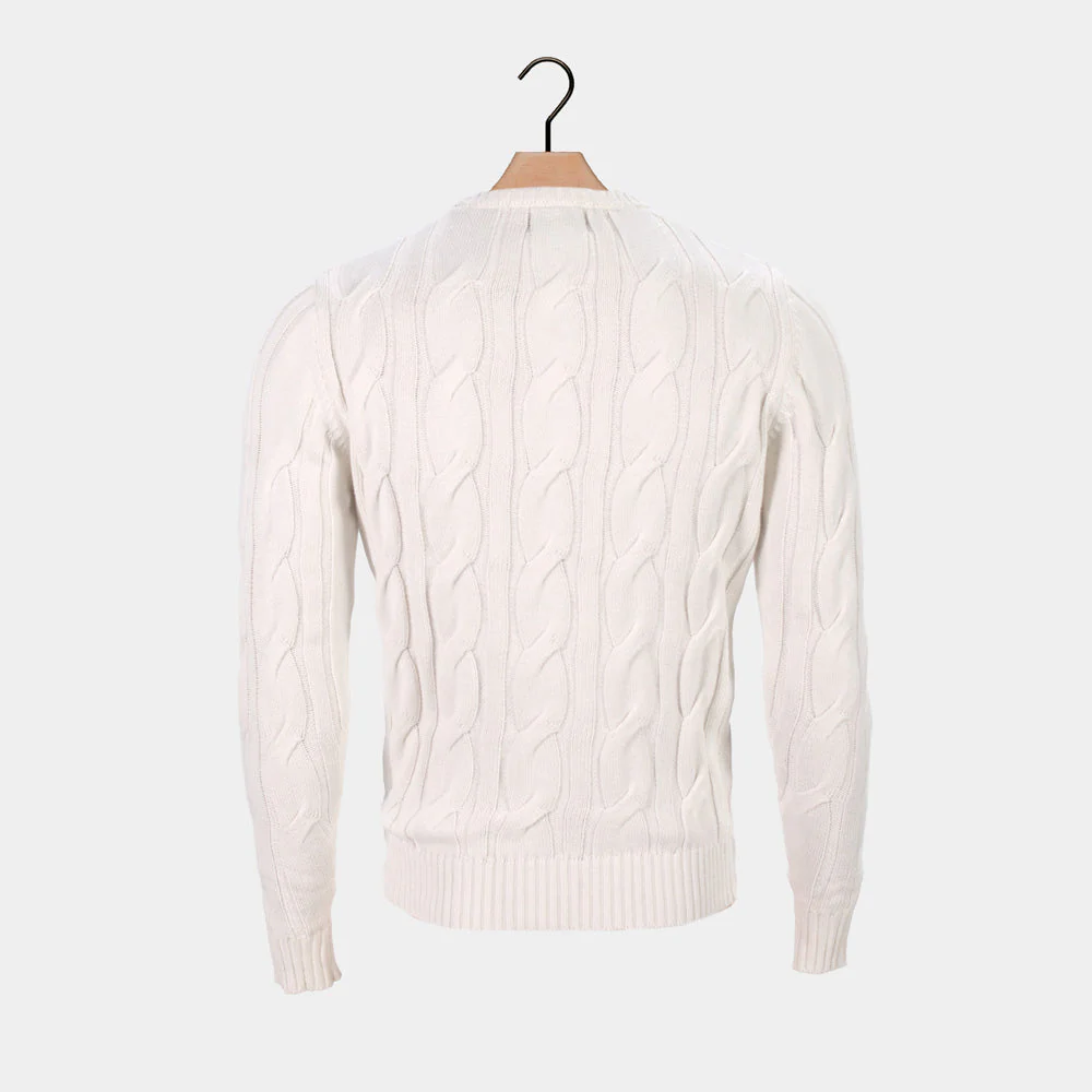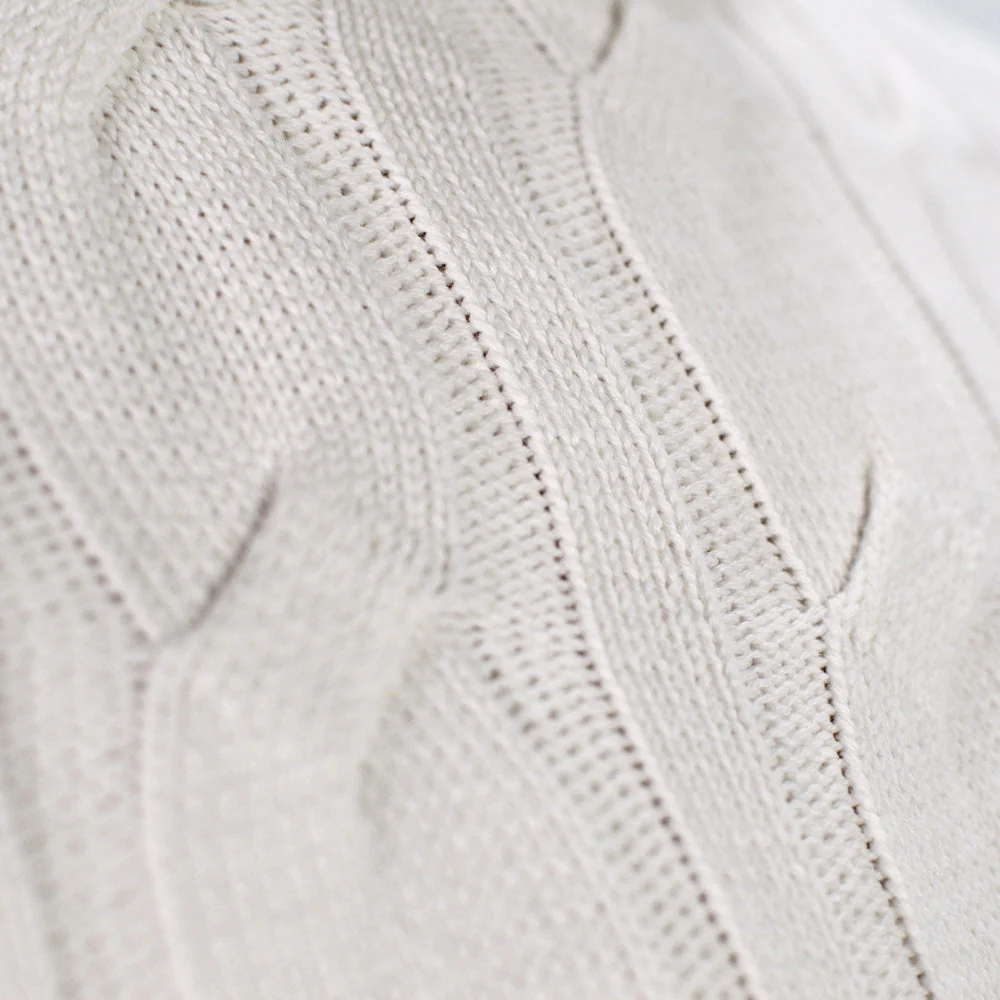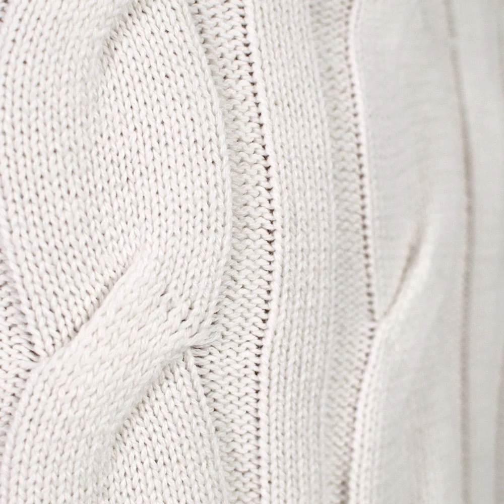 El suéter Snowfall en algodón orgánico 100% se inspira en la pureza y suavidad de la nieve al caer. Su diseño minimalista, con cuello vuelto y punto trenzado sobre base marfil, transmite una sensación de calma invernal y un acabado limpio y atemporal.