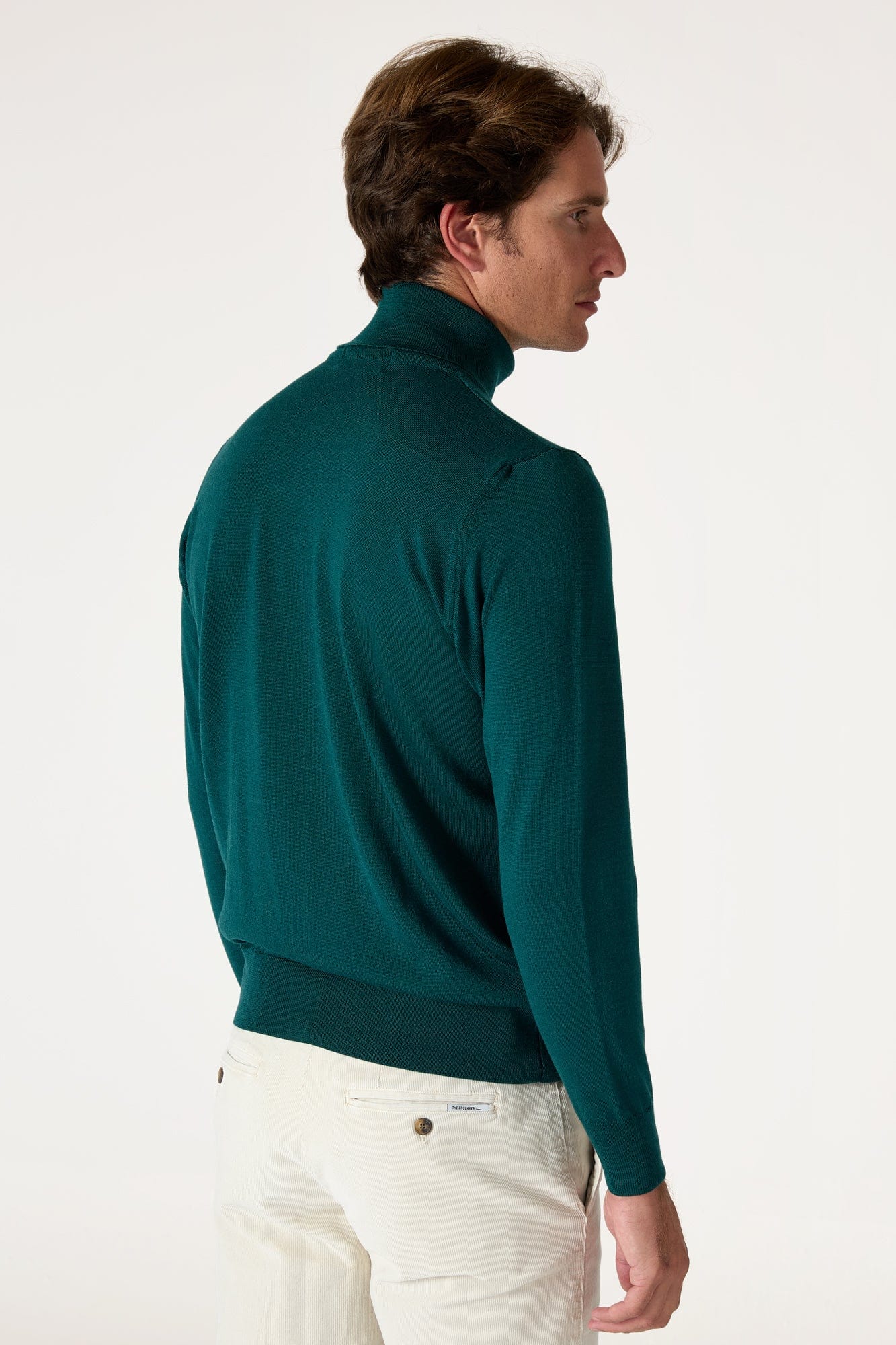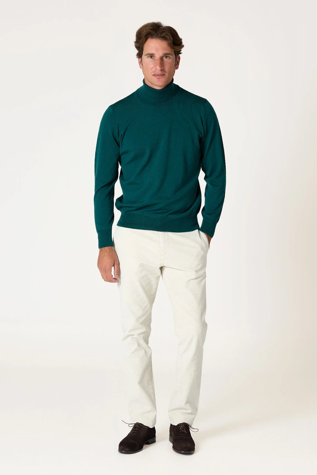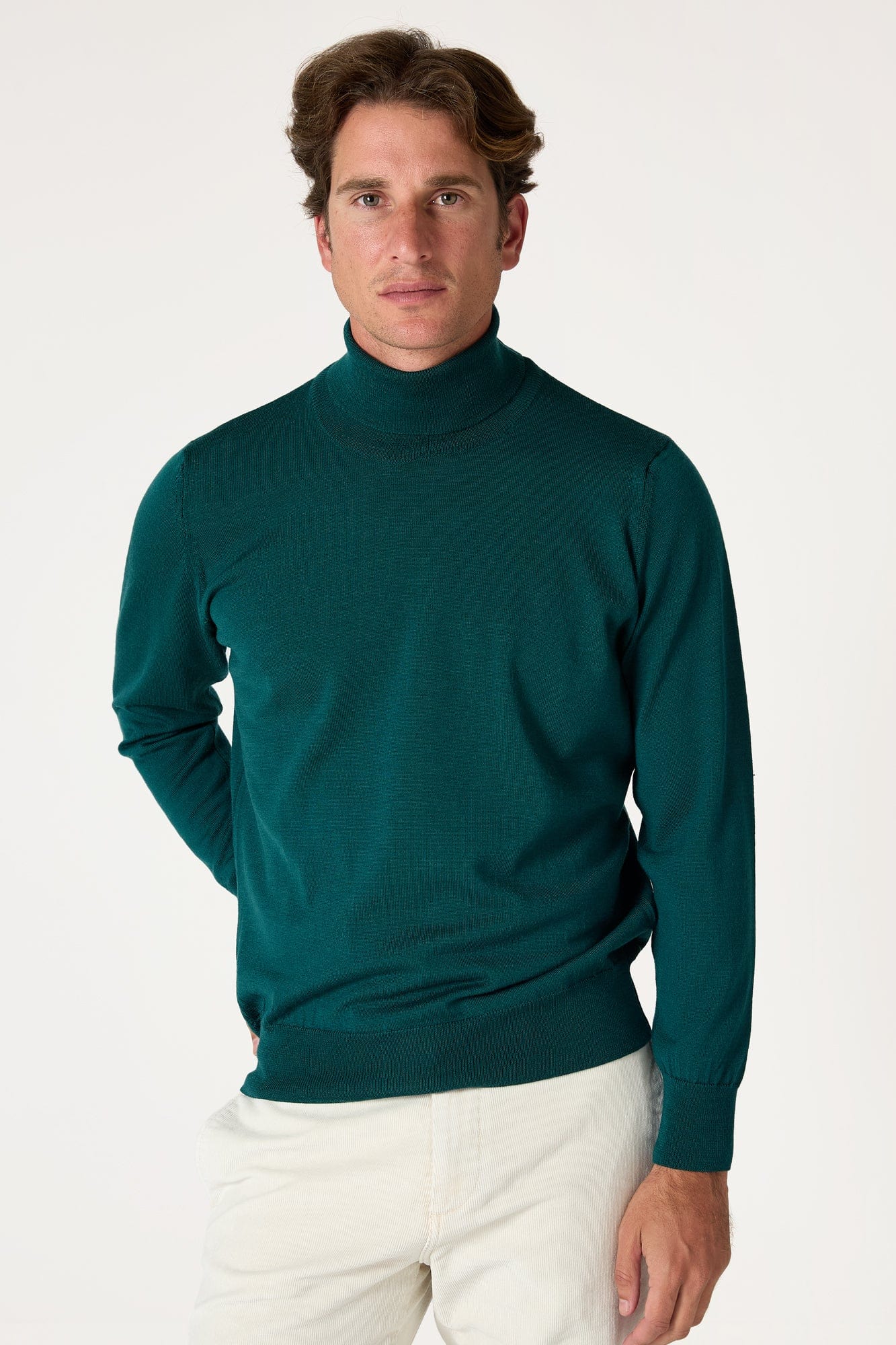 Este jersey liso de cuello cisne está confeccionado en lana merina 100 % natural. Su corte recto y las mangas largas aportan comodidad, calidez y una silueta limpia.