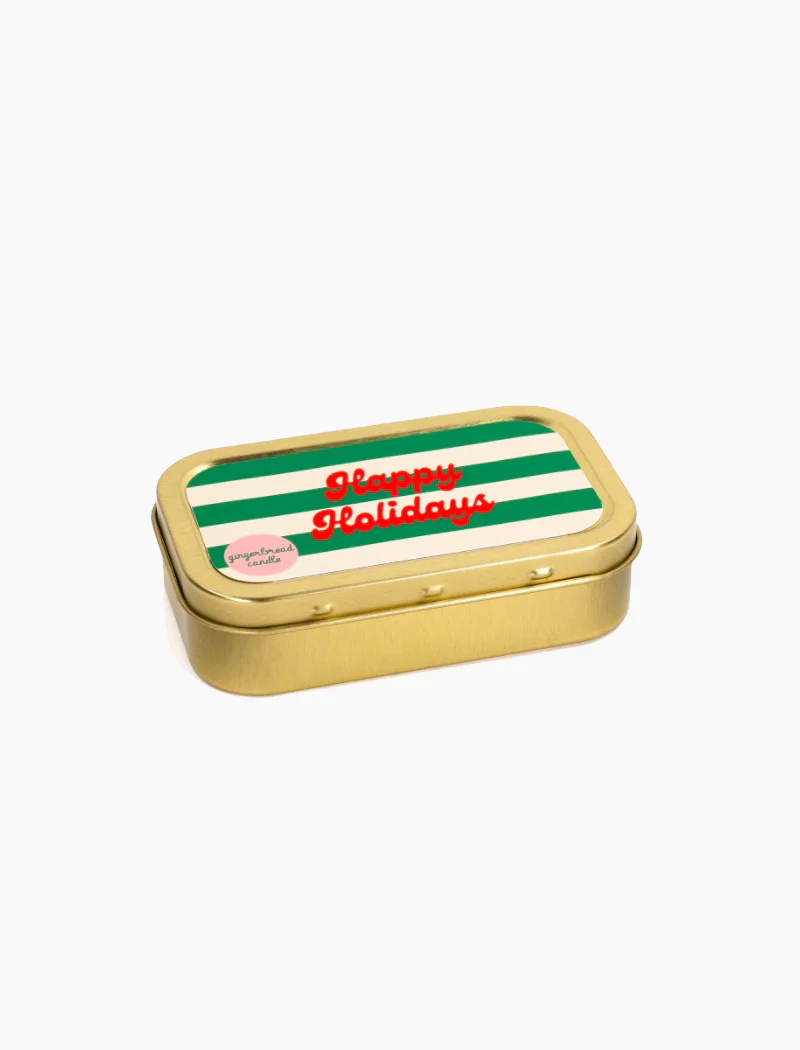 Vela de soja envasada en una cajita de hojalata con mensaje y un delicioso aroma a galleta de jengibre.