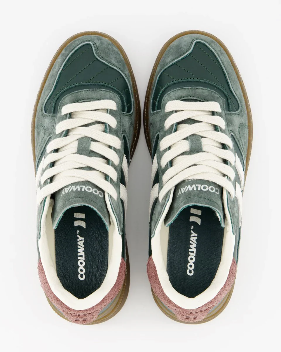 Las Coolway Goal Green Pulse son unas zapatillas deportivas de serraje con detalles en contraste. Llevan lengüeta preformada acolchada en piel, forro interior en piel, cordones planos de algodón bicolor intercambiables y suela flexible de goma/caucho para mayor durabilidad y agarre. El detalle del nombre “GOAL” en dorado envejecido en el lateral completa este diseño urbano con aire retro.